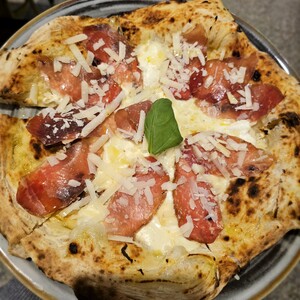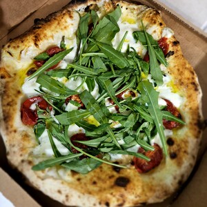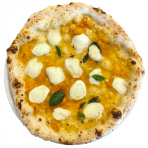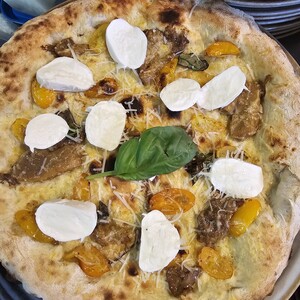 Mozzarella di Bufala, datterini gialli e pomodorini rossi; FUORI DAL FORNO: burratina stracciatella, Prosciutto Crudo di Parma e Granella di pistacchio.