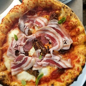 pomodoro, mozzarella di bufala Campana Dop, pomodori secchi, pancetta e basilico