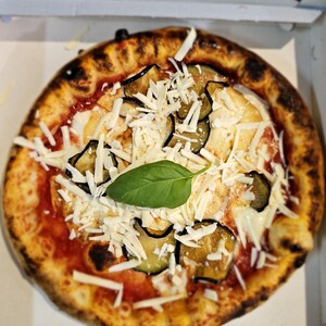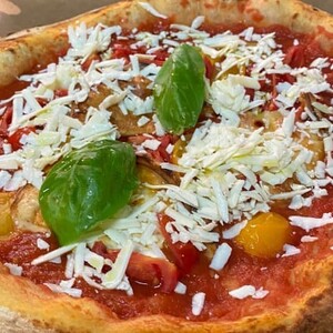 pomodoro, mozzarella fiordilatte, provola affumicata, melanzane fritte, cacioricotta e basilico