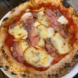 salsa di pomodoro, mozzarella fiordilatte, provola affumicata, olio al tartufo, funghi porcini trifolati e spolverata di Parmigiano Reggiano 24 mesi